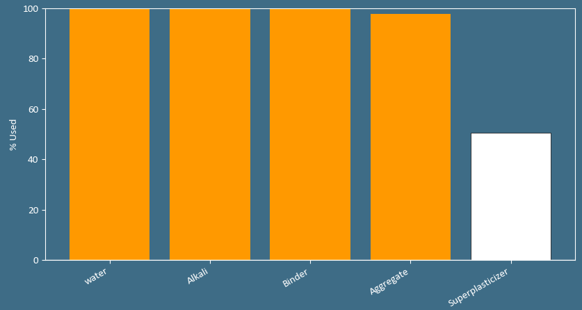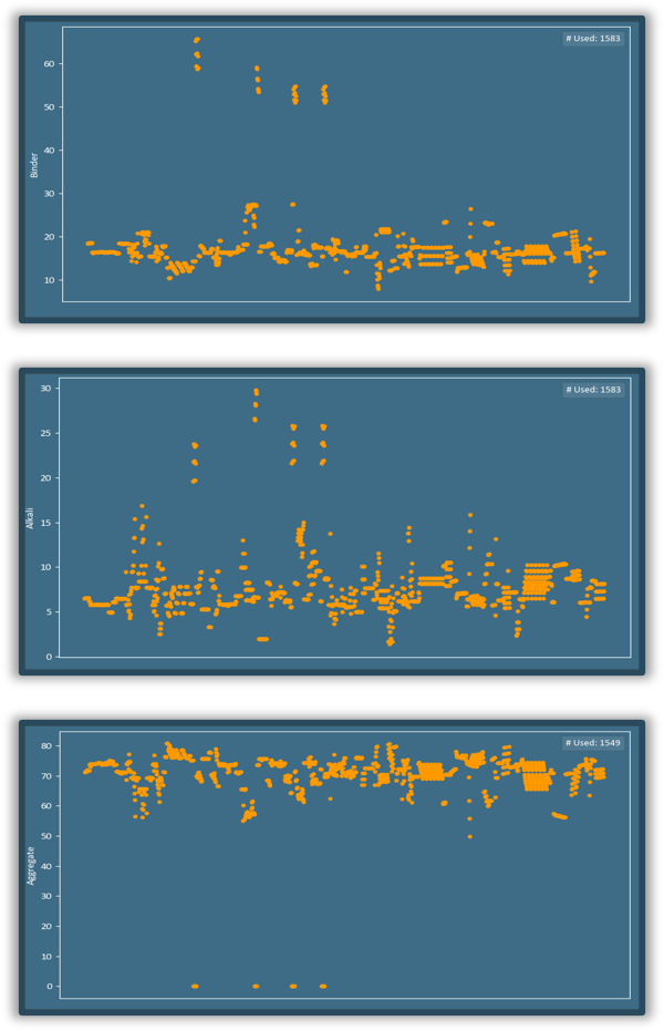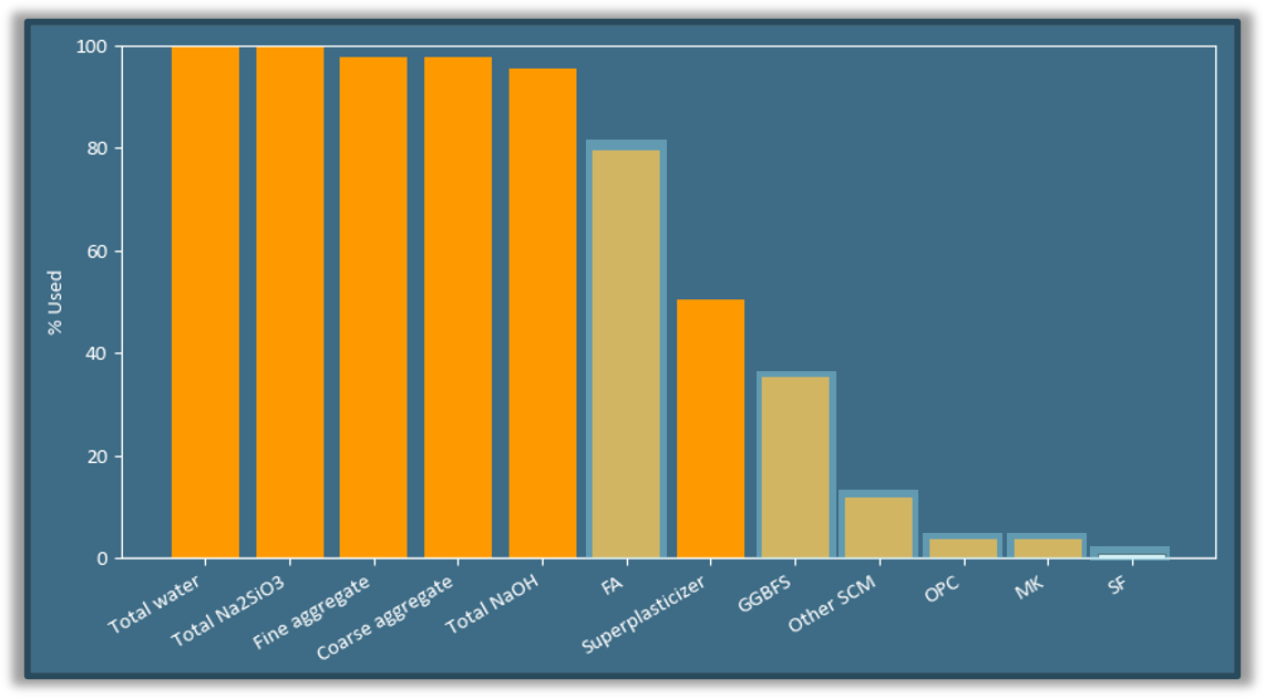 Starting off with the AAC’s main components/classes, FormuSense generates a bar plot and line plot for each ingredient class. As per the AAC expected recipe, all classes were used across all the formulations except the superplasticizer which in an optional ingredient.