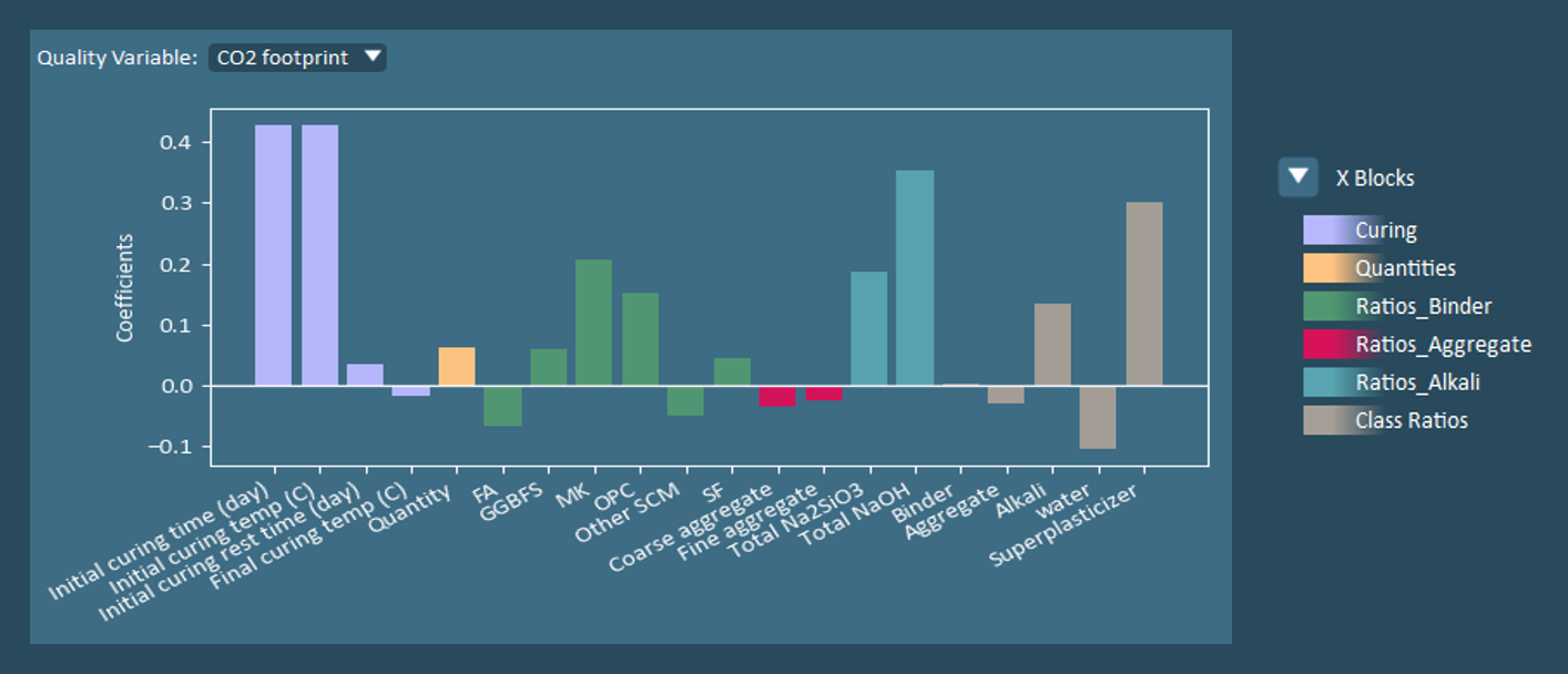 One of the most powerful plots in a PLS model for interpretation is the coefficient plot. This plot explains the simultaneous impact of all input variables on the final carbon footprint.