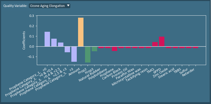 The model coefficients show the simultaneous impact of all the input variables to the specific quality variable. In this dataset, the goal is to maximize all of these metrics. However, from the coefficient plots we see that maximizing tensile strength would require prophene to be between 2.5-3% and lower than average 6PPD, while the other 3 properties are maximized when minimal prophene is added with more than average 6PPD.