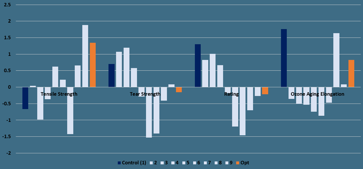 As shown in the above bar plot, the resulting optimal formulation would result in much higher-than-average tensile strength than the control, but near-average Tear Strength and Rating, and higher-than-average 3-day ozone elongation.