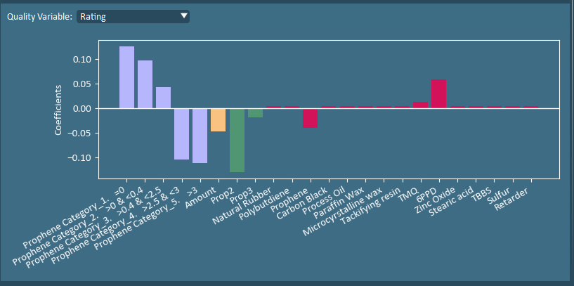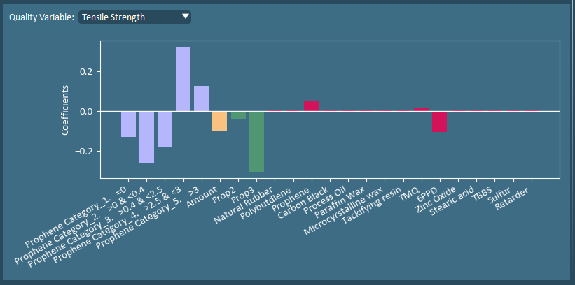 The model coefficients show the simultaneous impact of all the input variables to the specific quality variable. In this dataset, the goal is to maximize all of these metrics. However, from the coefficient plots we see that maximizing tensile strength would require prophene to be between 2.5-3% and lower than average 6PPD, while the other 3 properties are maximized when minimal prophene is added with more than average 6PPD.